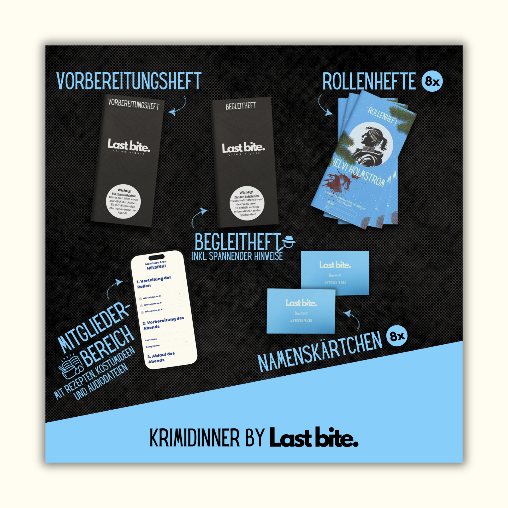 Unterstütze ein junges Startup bei der Entwicklung toller Detektivspiele und entdecke unser mit Leidenschaft kreiertes Last bite Krimidinner-Spiel. Wir testen jedes unserer Detektivspiele selbst und arbeiten ständig an neuen, spannenden Geschichten. Lege jetzt dein Krimidinner-Spiel von „Last bite“ in den Einkaufswagen und erlebe einen unvergesslichen Krimiabend.