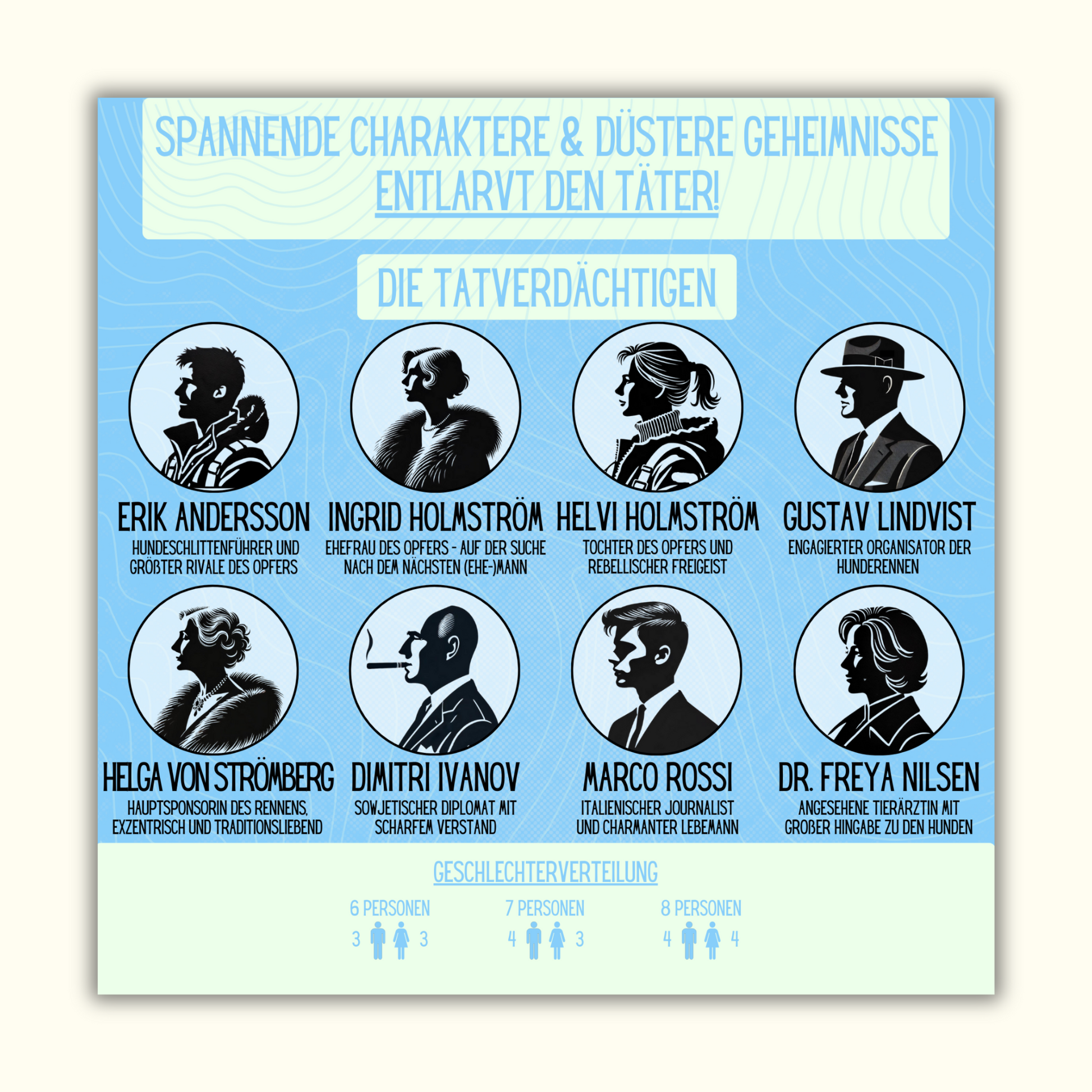 Übernehmt außergewöhnliche Rollen und werdet Hauptverdächtige in einem fesselnden Mordfall. In diesem interaktiven Krimispiel kombiniert ihr Hinweise, entlarvt Geheimnisse und deckt den Mörder auf – aber passt auf, er ist noch unter euch!