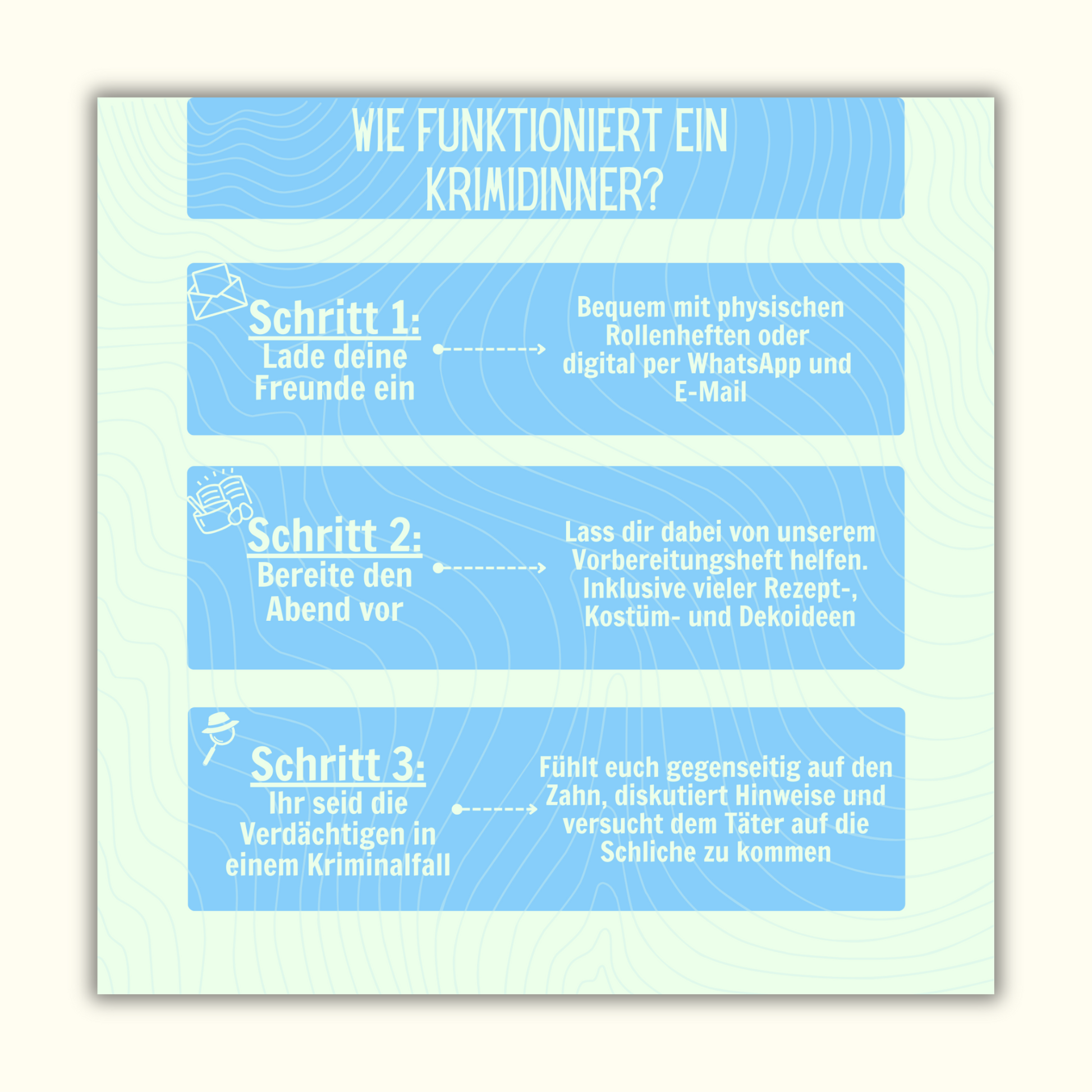 Von stilvollen Tischkarten über köstliche Rezeptideen bis hin zu kreativen Dekorationen – Alles, was du für einen entspannten Krimiabend als Gastgeber brauchst, ist in unserem Krimidinner-Spiel enthalten.