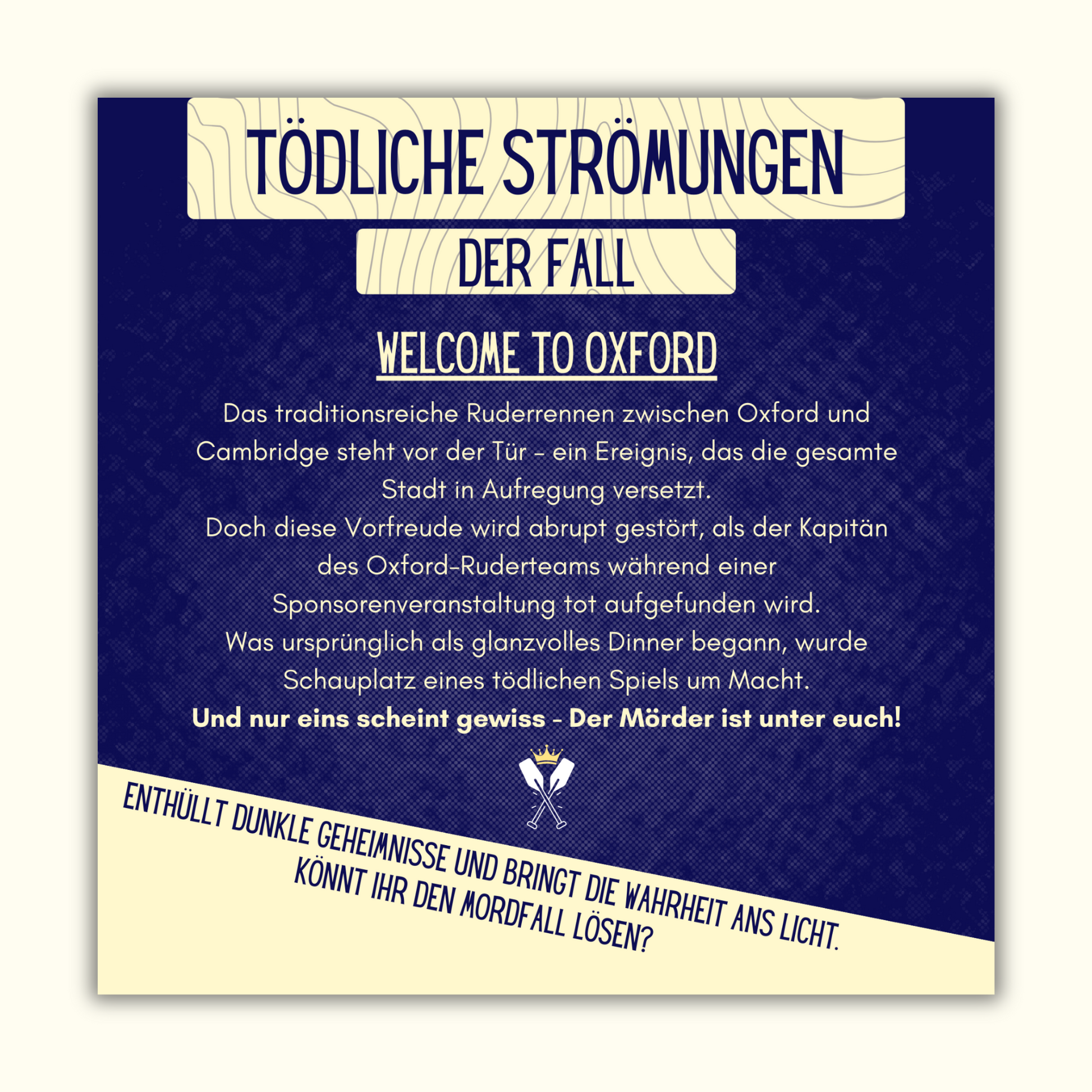 1923 - Das traditionsreiche Ruderrennen zwischen Oxford und Cambridge steht vor der Tür, ein Ereignis, welches die gesamte Stadt in Aufregung versetzt. Die Luft ist erfüllt von Vorfreude und Ehrgeiz und die besten Ruderer beider Universitäten stehen kurz vor ihrem größten Wettkampf, als die Leiche des Kapitäns der Oxford-Rudermannschaft entdeckt wird.